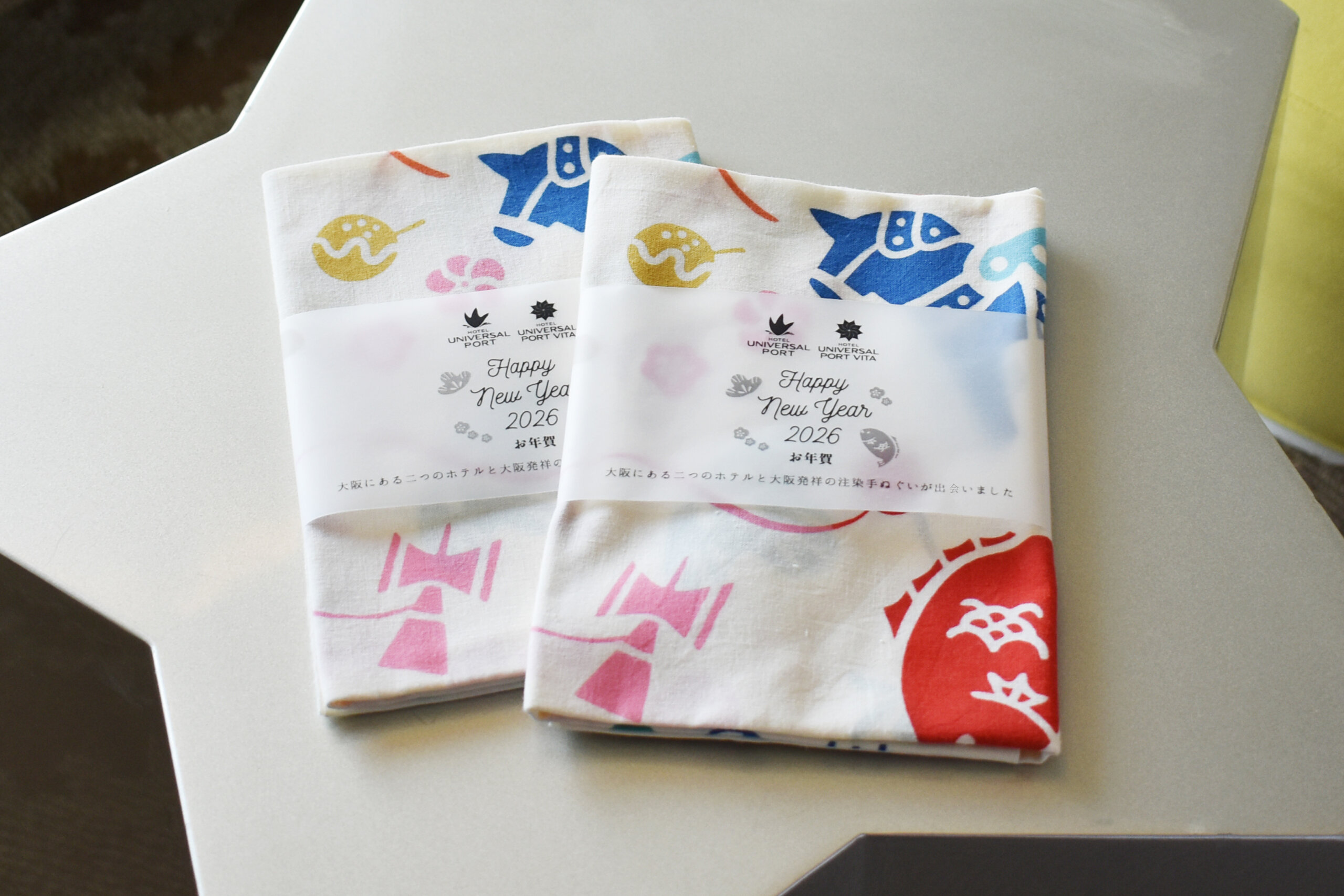 デザイン・製作は、大阪・堺の注染工房が担当。羽子板や鯛などの正月モチーフに加え、たこ焼きなど大阪らしいユーモアも盛り込み、華やかで可愛らしい図案に仕上げました。新しい一年の幕開けを、より楽しく思い出深いものにしていただけるよう、地域の文化とともにお届けする当ホテルならではの特典です。ぜひご期待ください。