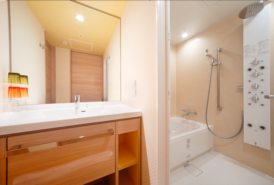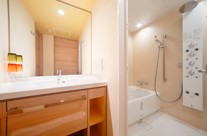 オーバーヘッドシャワーとボディシャワーの機能付き。広々とした洗い場付きのバスルームなので、お子さまとのご入浴も快適です♪