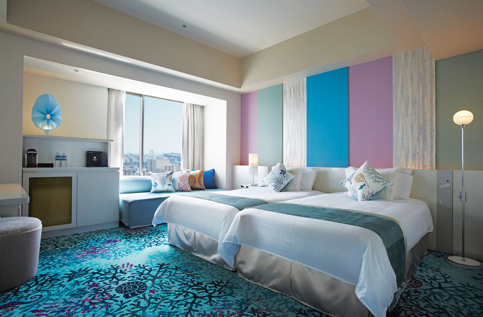 ホテルの最上階に位置し、エレベーターを降りると、目の前には深海の世界が広がり、深海の青と海底をイメージした客室からは、行き来する船やベイエリアの夜景に心和むハーバーサイド、またはワクワク&ドキドキがあふれるパークサイドの眺めをお楽しみいただけます。室内には珊瑚や貝殻、クラゲをモチーフとした装飾を施し、深海にいるような空間でおくつろぎいただけます。エスプレッソマシーンや中反発マットレス、BOSEのサウンドバーなど同フロアだけの備品・設備をご用意し、非日常なホテルステイをお楽しみいただけます。また、同フロアの宿泊サービスとして、チェックインを専用エリアにて通常より1時間早く手続きできます。「PORT DEEP OCEAN FLOOR」で五感を刺激するステイをお楽しみください。
