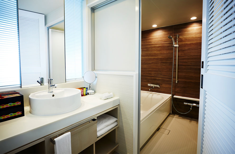 最大3名様利用(34㎡)でホテル最上階に位置するオーシャンキングは、全室ハーバーサイドに面しており、大阪ベイエリアの開放的な景色をお楽しみいただけます。また他のフロアのお部屋より一回り大きな洗い場付のバスルームを完備。お部屋内では靴を脱いでお過ごしいただけます。
