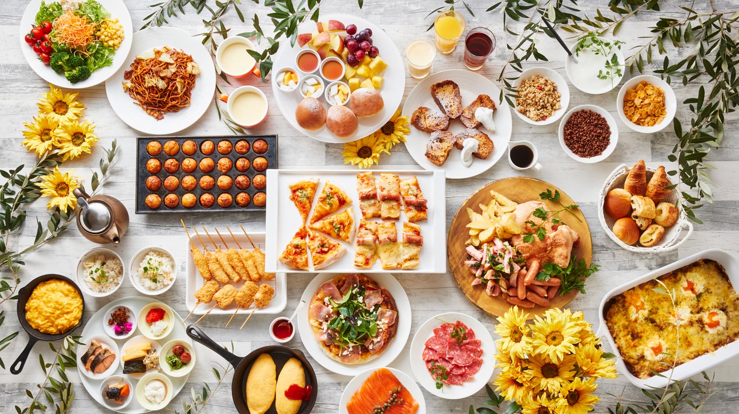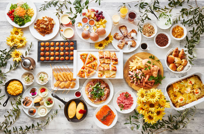 シスターホテルであるホテル ユニバーサル ポート内レストランの「ポートダイニング リコリコ」でディナービュッフェ。シーズンごとのフェアメニューや、まるで宝石箱の中の宝石のようにずらりと並んだ可愛らしいデザートなど、約70種類の多彩なメニューに心もわくわく♪