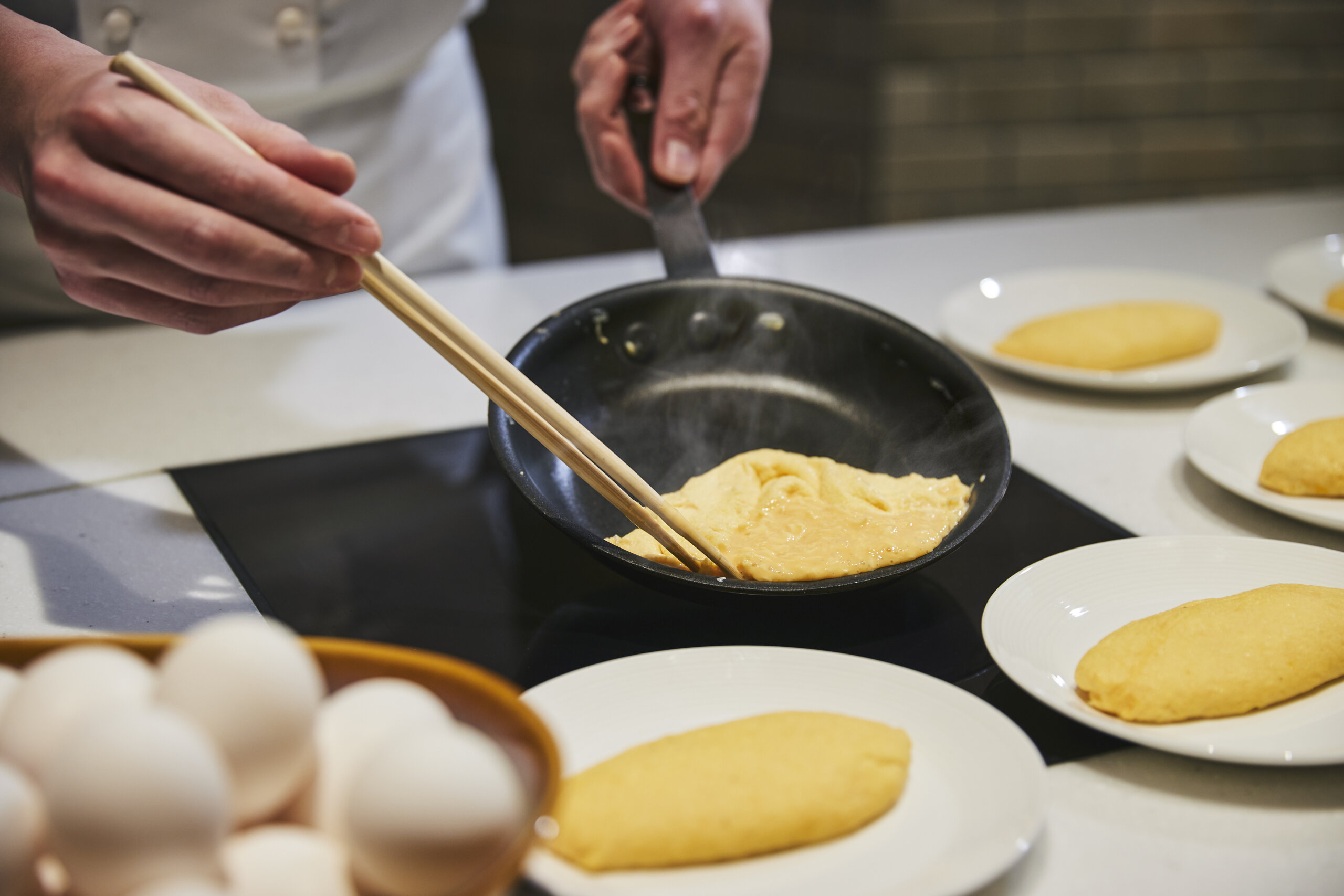シェフが目の前で焼き上げるふわふわオムレツ。ケチャップやトマトクリームソースでお好みの味をどうぞ。