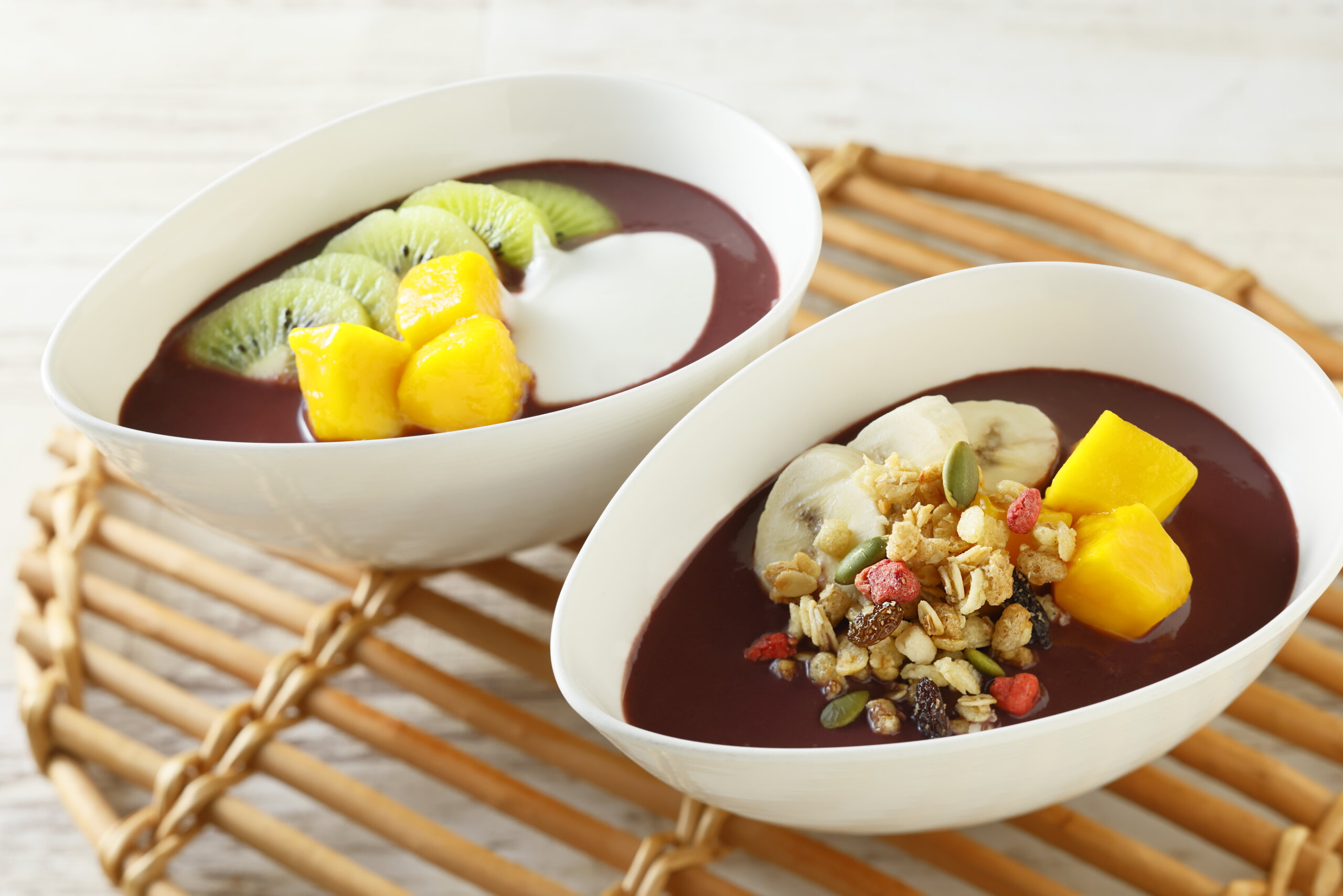 からだにうれしいアサイーボウル。フルーツやヨーグルト、グラノーラをのせて、甘さを足すならはちみつも♡