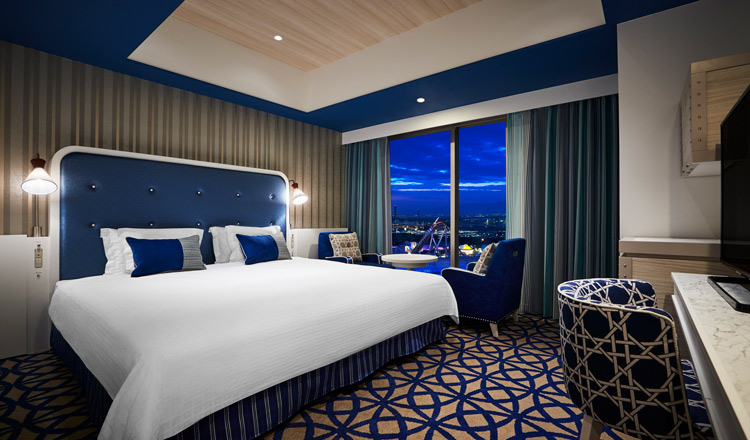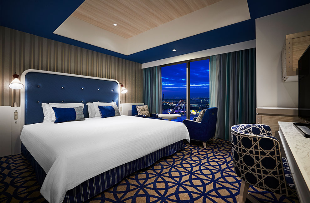 最大2名様利用(28㎡)のエーゲ スタンダードキングは、白と青のさわやかな世界で、エーゲ海をテーマにしたお部屋です。幅200cmのキングサイズベッドを設置しており、お子さまが添い寝されてもゆったりお休みいただけます。バスルームは洗い場付で、ゆったりとバスタイムをお過ごしいただけます。