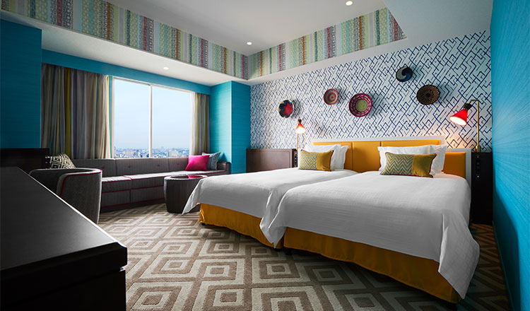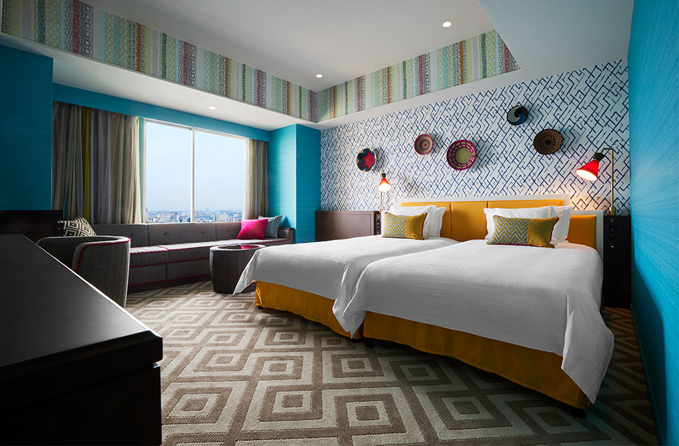 2~3名様利用(34㎡)の「カリブ スーペリア」は、カリブ海の楽しさと異国情緒を味わえるインテリアでカラフルな色使いのお部屋です。高層階に位置しており、窓からの開放感ある景色をお楽しみいただけます。 バスルームは洗い場付で、ゆったりとバスタイムをお過ごしいただけます。