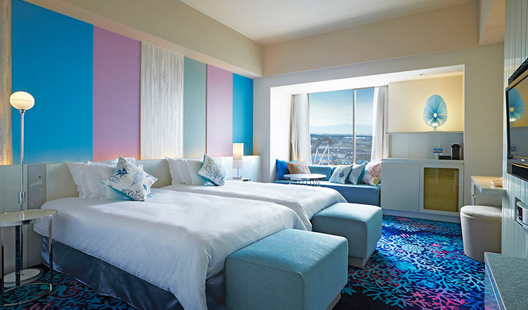 最大4名様利用(40㎡)でホテル最上階に位置するオーシャンデラックスは、全室パークサイドに面しており、パークの余韻をそのままに、ゆったりとした時間をお楽しみください。バスルームは、洗面と脱衣スペースを仕切り、入浴中のプライバシーを確保しました。室内には大きな鏡のついた鏡台を設置しており、ソファに座りながらゆったりと身支度していただけます。