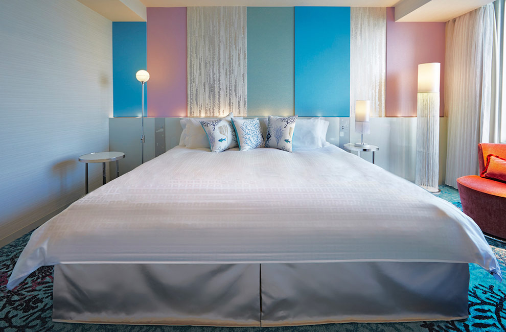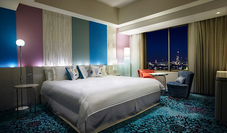 最大3名様利用(34㎡)でホテル最上階に位置するオーシャンキングは、全室ハーバーサイドに面しており、大阪ベイエリアの開放的な景色をお楽しみいただけます。また他のフロアのお部屋より一回り大きな洗い場付のバスルームを完備。お部屋内では靴を脱いでお過ごしいただけます。