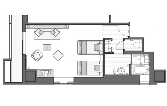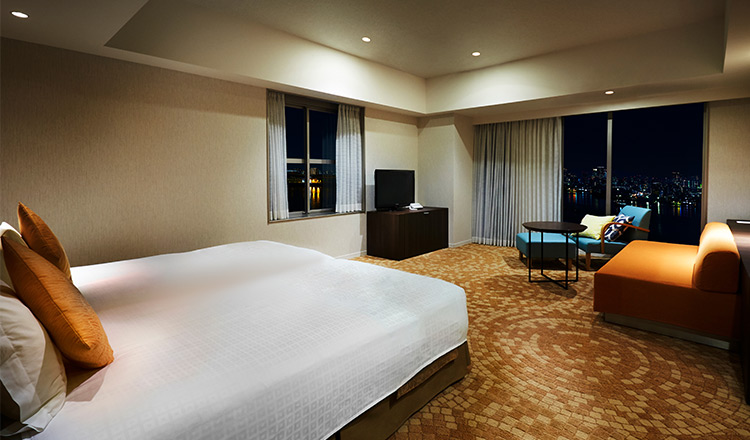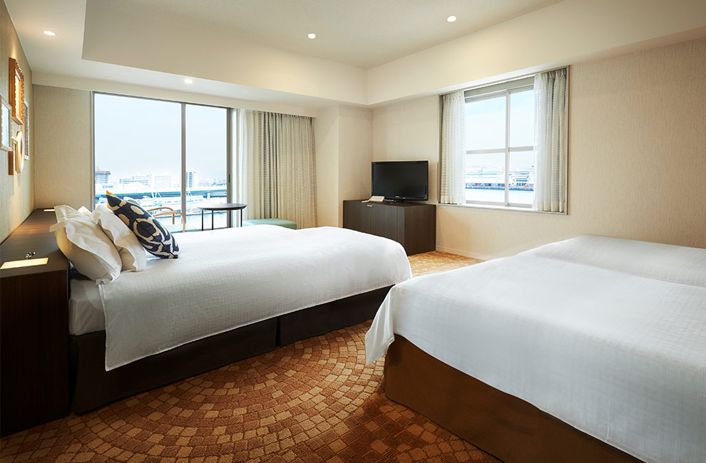 最大4名様利用(46㎡)の角部屋です。46㎡という広さに加え、2面の窓からは景色を広く見渡すことができ、4名様まで宿泊できますので、開放感のあるゆったりとした滞在をお楽しみいただけます。