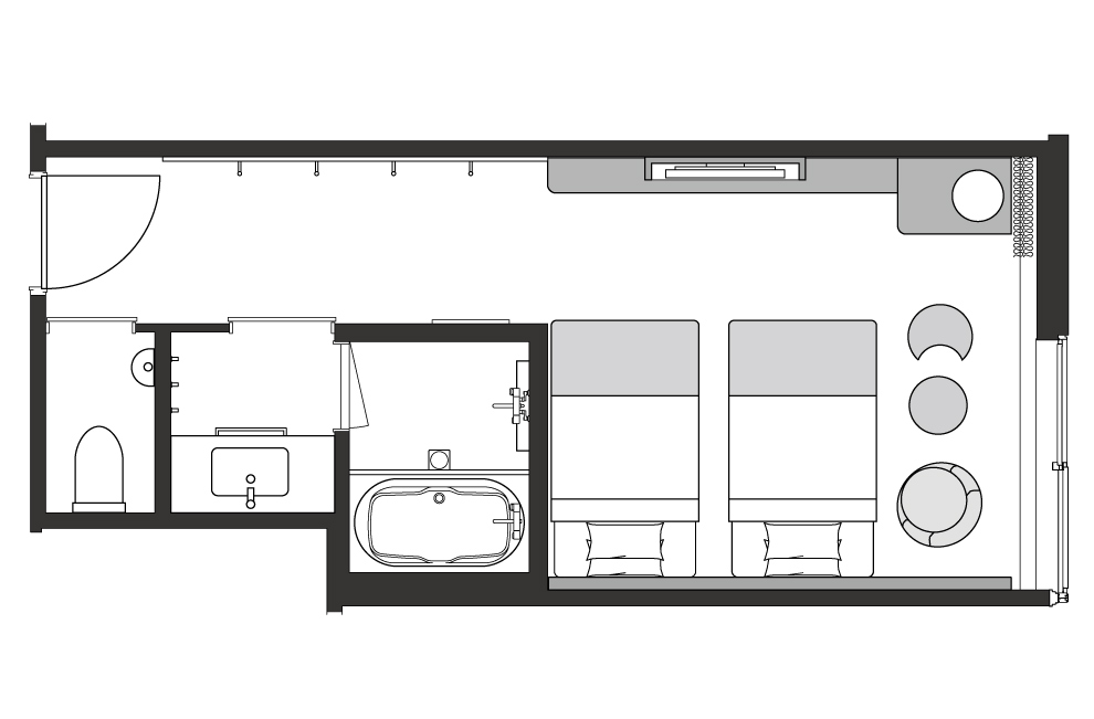最大3名様利用(28㎡)のお部屋。低層階は陽だまりのような温もりを、高層階は屈折するプリズムの光をイメージしています。デュベ仕様のお布団とふかふかのマットレスで、心地よい寝心地を提供いたします。さらにバス・トイレセパレートで快適にお過ごしいただけます。※お部屋タイプはご指定いただけません。