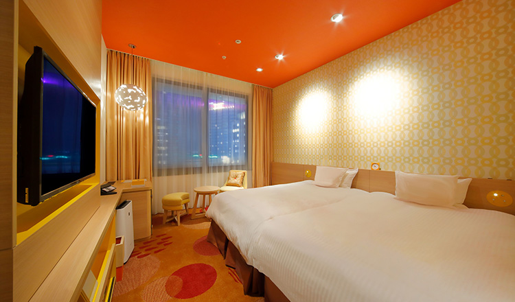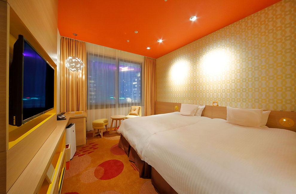 低層階は陽だまりのような温もりを、高層階は屈折するプリズムの光をイメージした28㎡のお部屋です。デュベ仕様のお布団とふかふかのマットレスで、心地よい寝心地を提供いたします。さらにバス・トイレセパレートで快適にお過ごしいただけます。また、ユニバーサルシティ側のお部屋からは窓から電車が見え、お子さまに大人気。ハーバー側のお部屋からは眼下の川を行き交う船の往来や、夜には大阪市内の夜景を満喫いただけます。